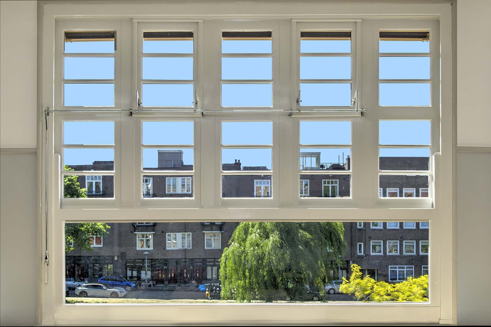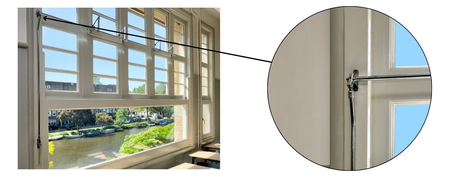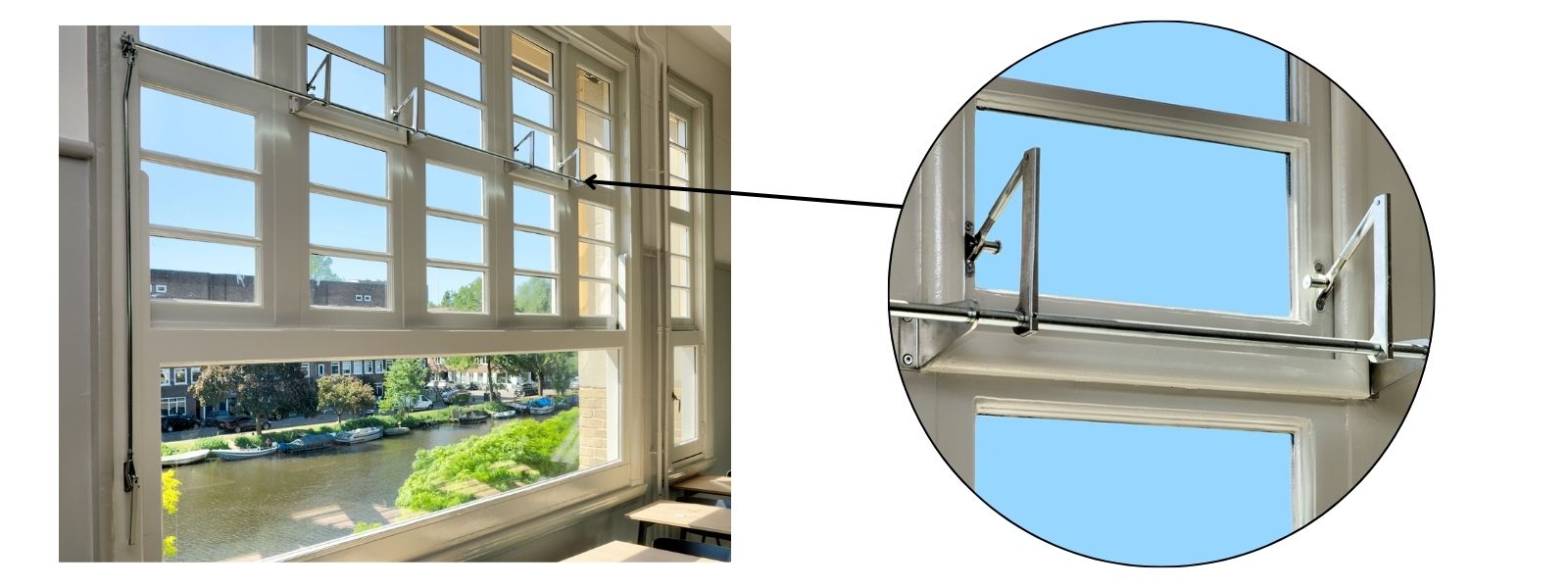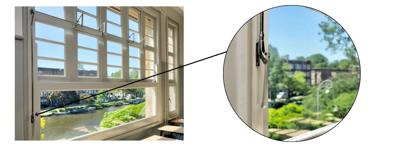Het oude schuifraam werd vervangen door een nieuw vast raam, met speciaal op maat gemaakte steunen voor de bovenraamsluitingen. Dankzij de Atmos15 bovenraamsluitingen van GSG bleef de authentieke uitstraling behouden, terwijl de ramen nu voldoen aan moderne eisen voor functionaliteit en veiligheid.